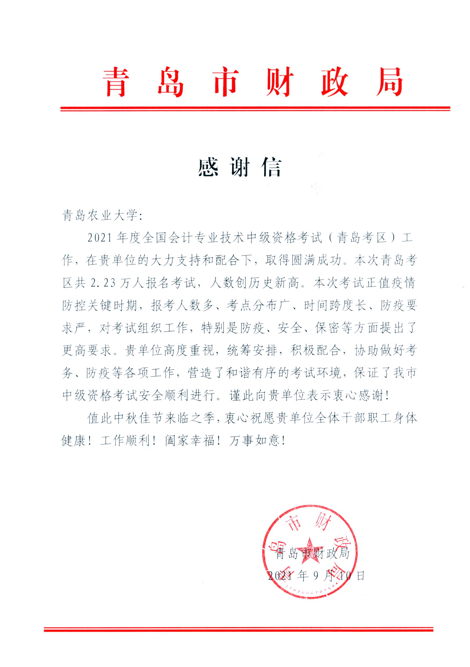2021年9月10日,青岛市财政局向公司寄来感谢信,感谢公司对2021年度全国会计专业技术中级资格考试(青岛考区)工作的大力支持和配合。