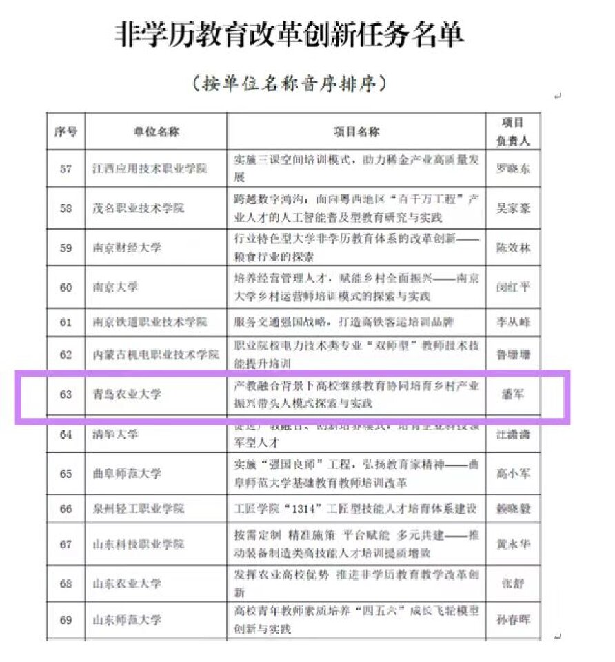近日,教育部职业教育与成人教育司公布了2024年学习型社会建设重点任务(高等继续教育领域)培育建设名单,公司申报的《产教融合背景下高校继续教育协同培育乡村产业振兴带头人模式探索与实践》项目成功入选非学历教育改革创新任务培育建设名单。此次,全国共有103个非学历教育项目入围,公司成为全国农林高校中5所入选高校之一,同时也是山东省12所入围高校之一。