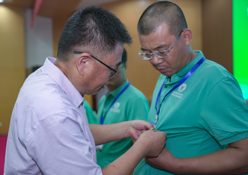 随后,隋国武给来自烟台、潍坊、威海、济宁、菏泽、临沂六个地市的学员代表佩戴了校徽。