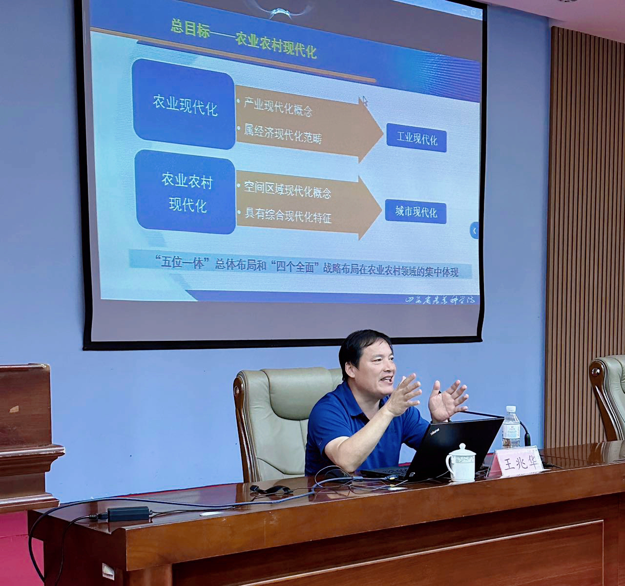 仪式结束后,山东省农业科公司乡村振兴研究院首席专家王兆华教授对全面推进乡村振兴的相关政策进行了介绍和详细的解读,从国家到山东,再到具体区域,由浅入深、全面深刻,学员们认真倾听并拍照记录,课后学员又带着问题与王教授积极讨论,学习氛围浓厚。