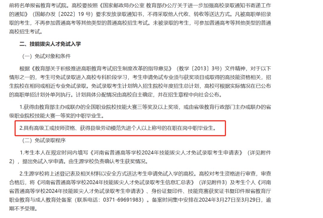 具有高级工或技团队格的在职在岗中等职业公司毕业生可以免去单招考试,直接就读高职院校,这为技术技能型人才提供了更多的教育机会。